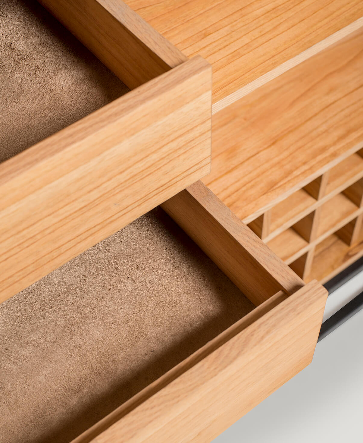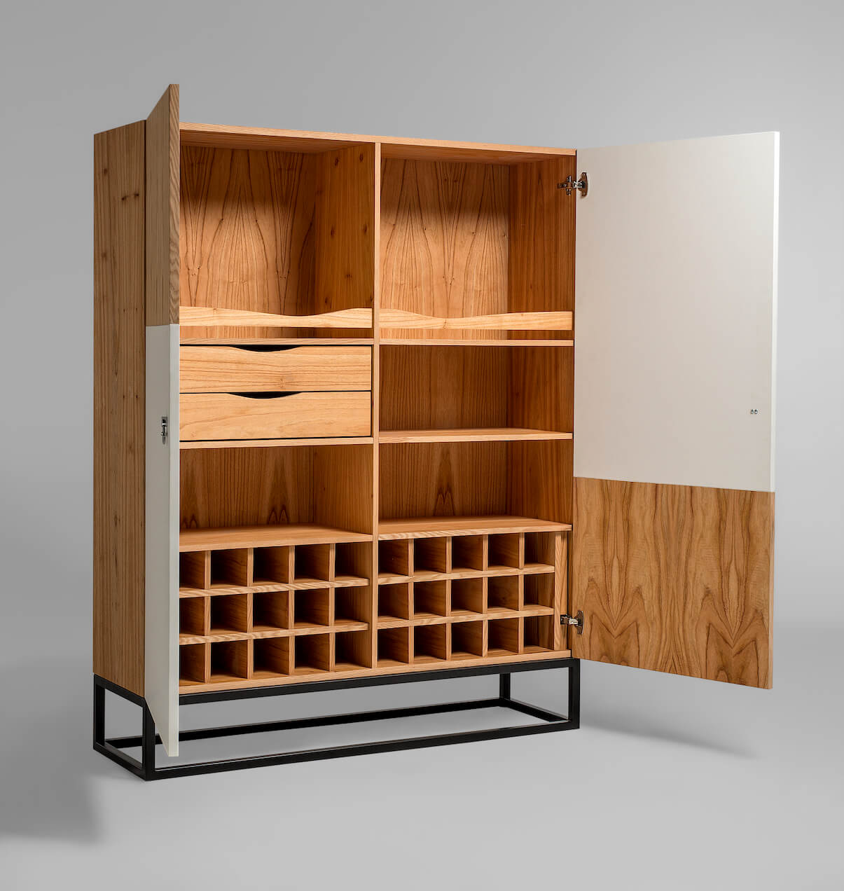 Celebrating the classic forms of cabinetry design, the Remo cabinet, being both warm and elegant, is a blank canvas for Architects and Designers to work with home decor. It will integrate wonderfully with contemporary and modern interior designed rooms. Fabricated by hand, it features a metallic base, shelving area, velvety lined and damped drawers, damped doors, ample interior space and a dedicated wine rack section to provide delicate storage of wine and other bottles.