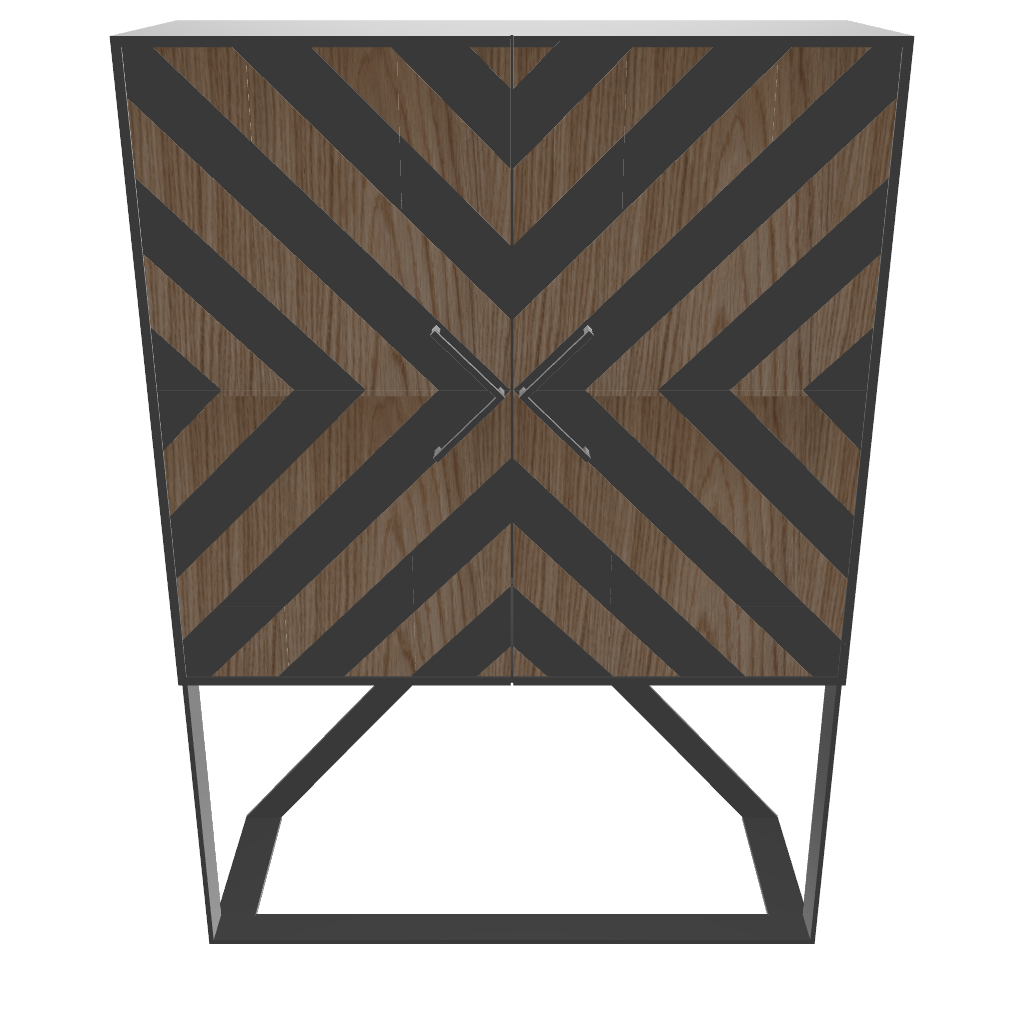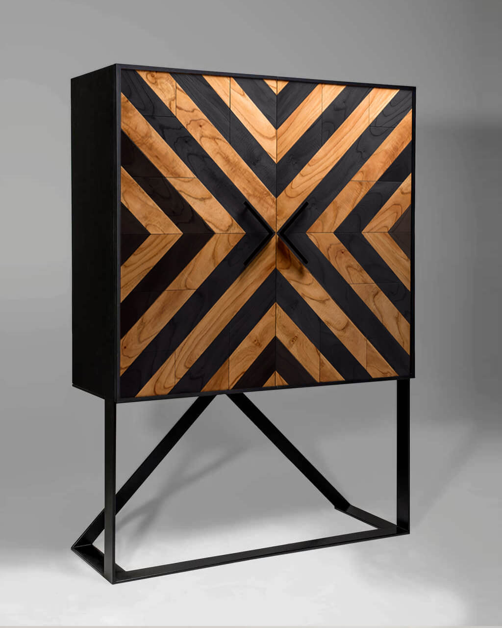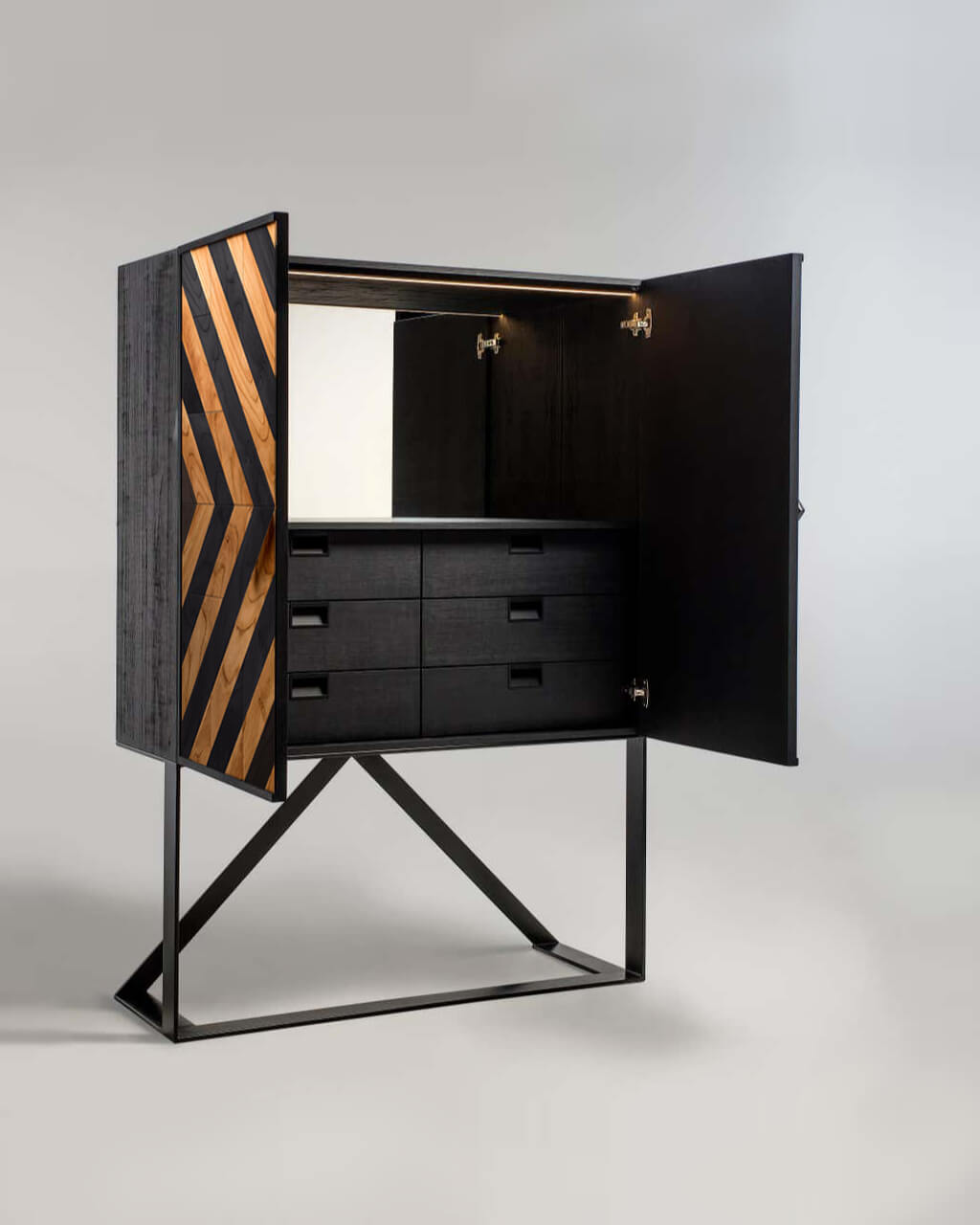 • The Tigah Iki features an all handmade wood construction and hand applied studs, a sophisticated velvety fabric coated interior, a modern metallic base and dampened hinges on all doors.