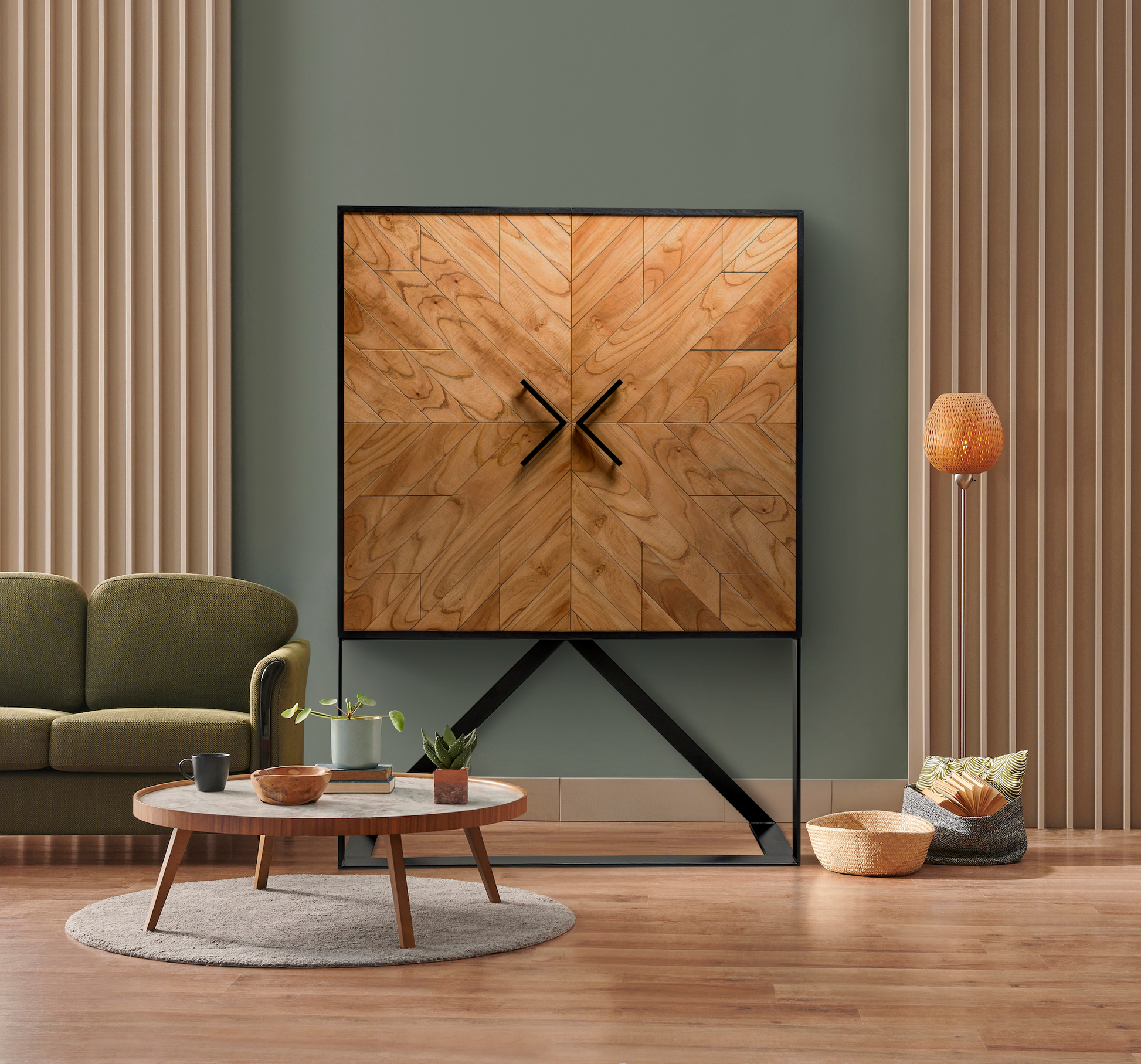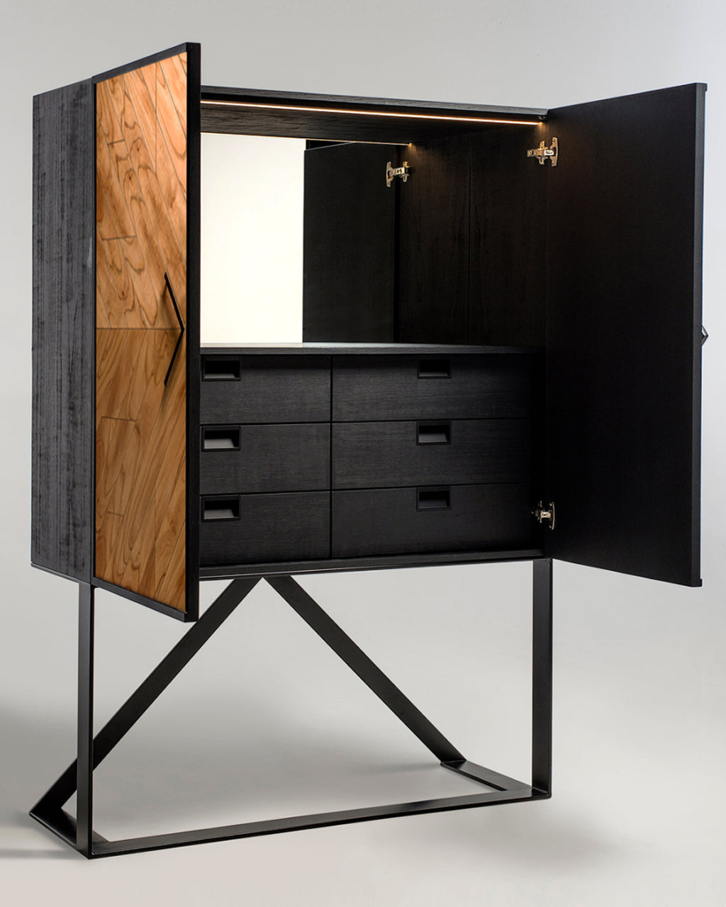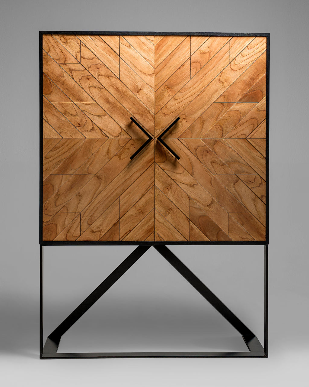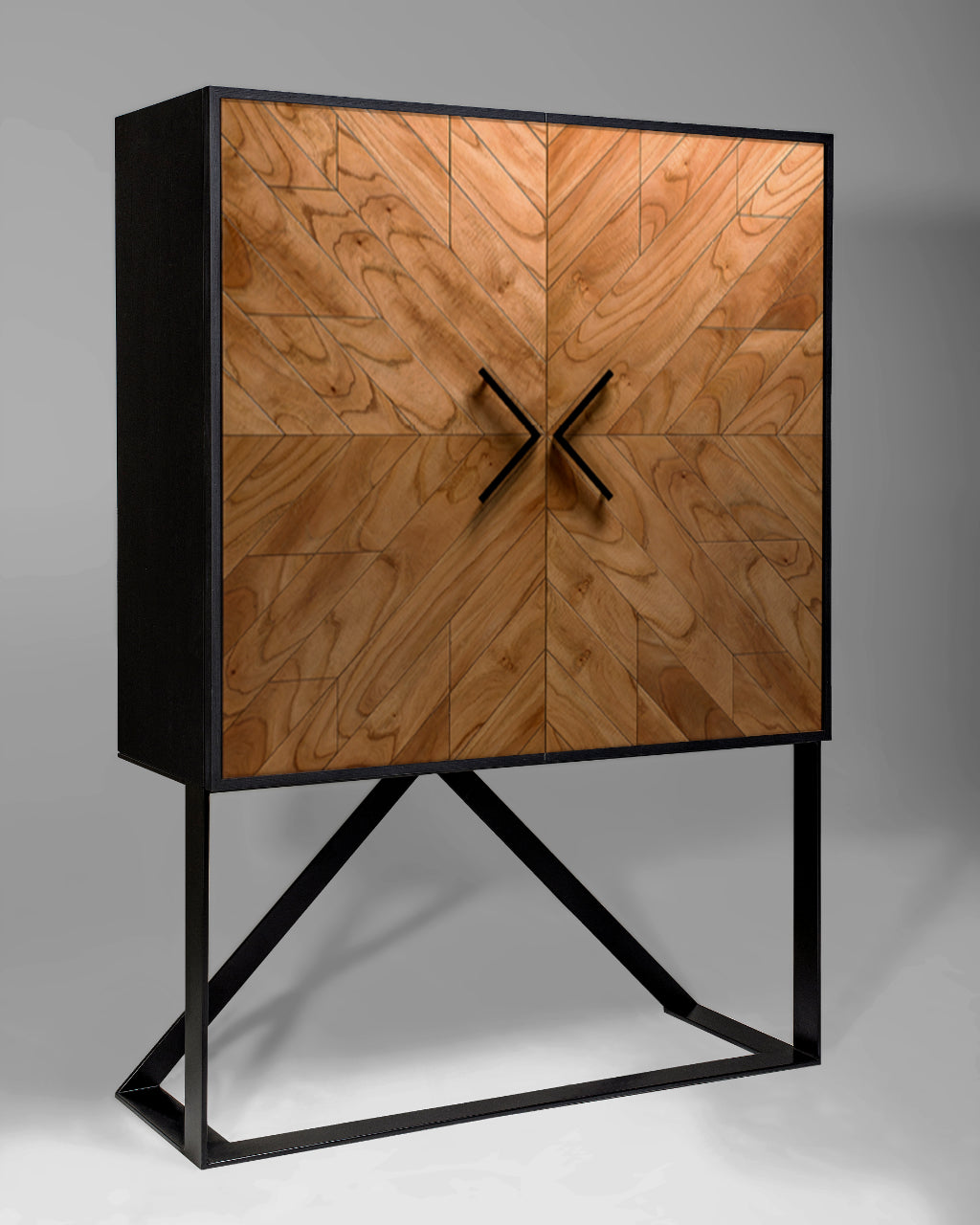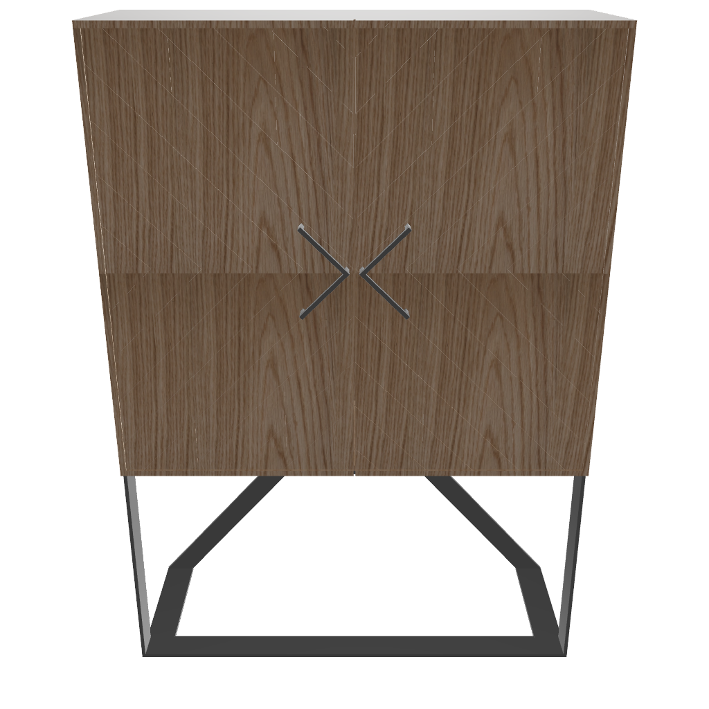 The Tigah Iki features an all handmade wood construction and hand applied studs, a sophisticated velvety fabric coated interior, a modern metallic base and dampened hinges on all doors.
