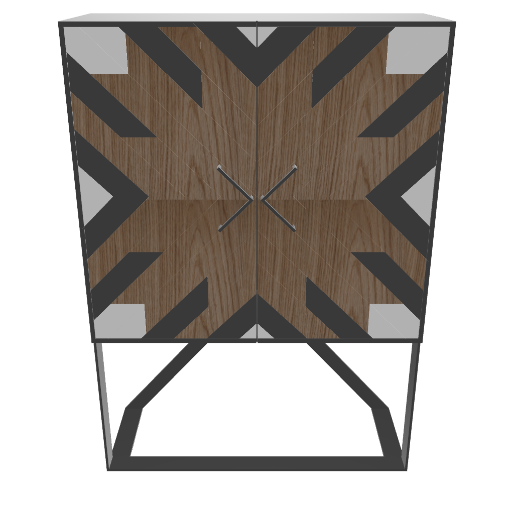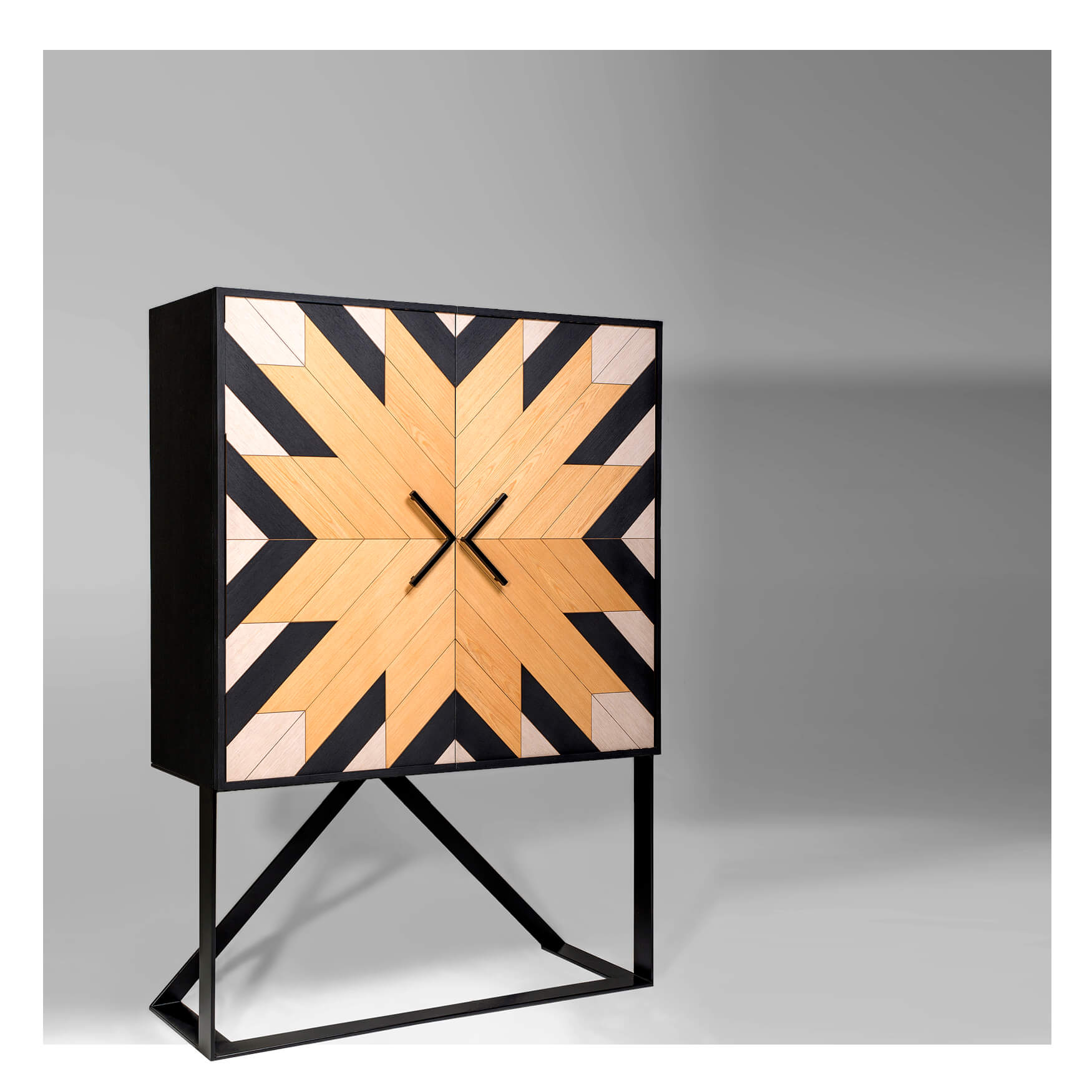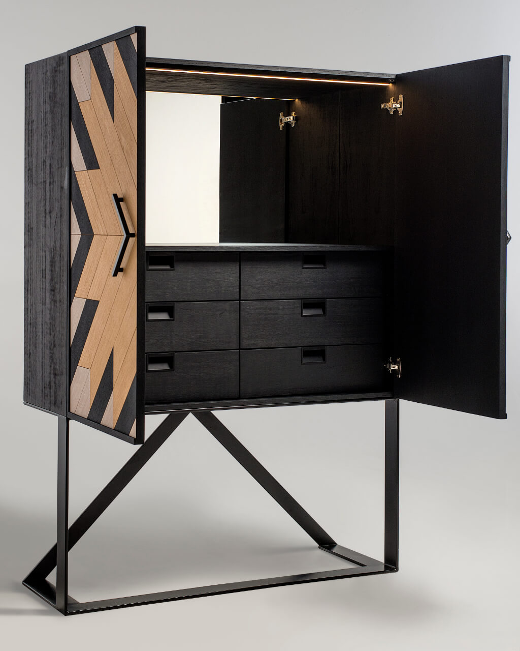 Created by international designer Larissa Batista and handcrafted by skilled woodworkers in one of our studio's factories, this contemporary piece is a home decor must-have. Fusing its mid-century modern design origin with the designer's characteristic tribal inspirations, this cabinet features a distinct natural, white and black oak finishes, which are complemented by the door's matching metal door knobs. Inside, warm LEDs illuminate the cabinet's ample storage space.