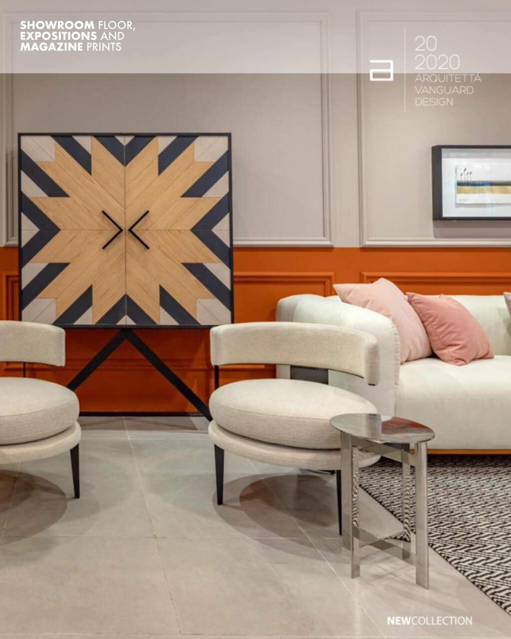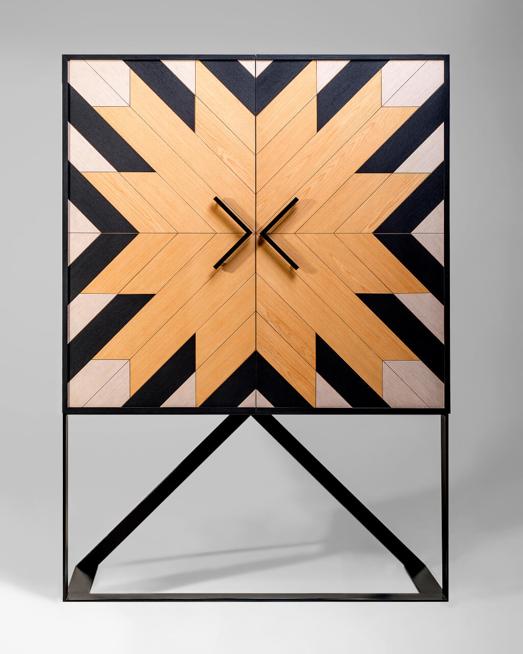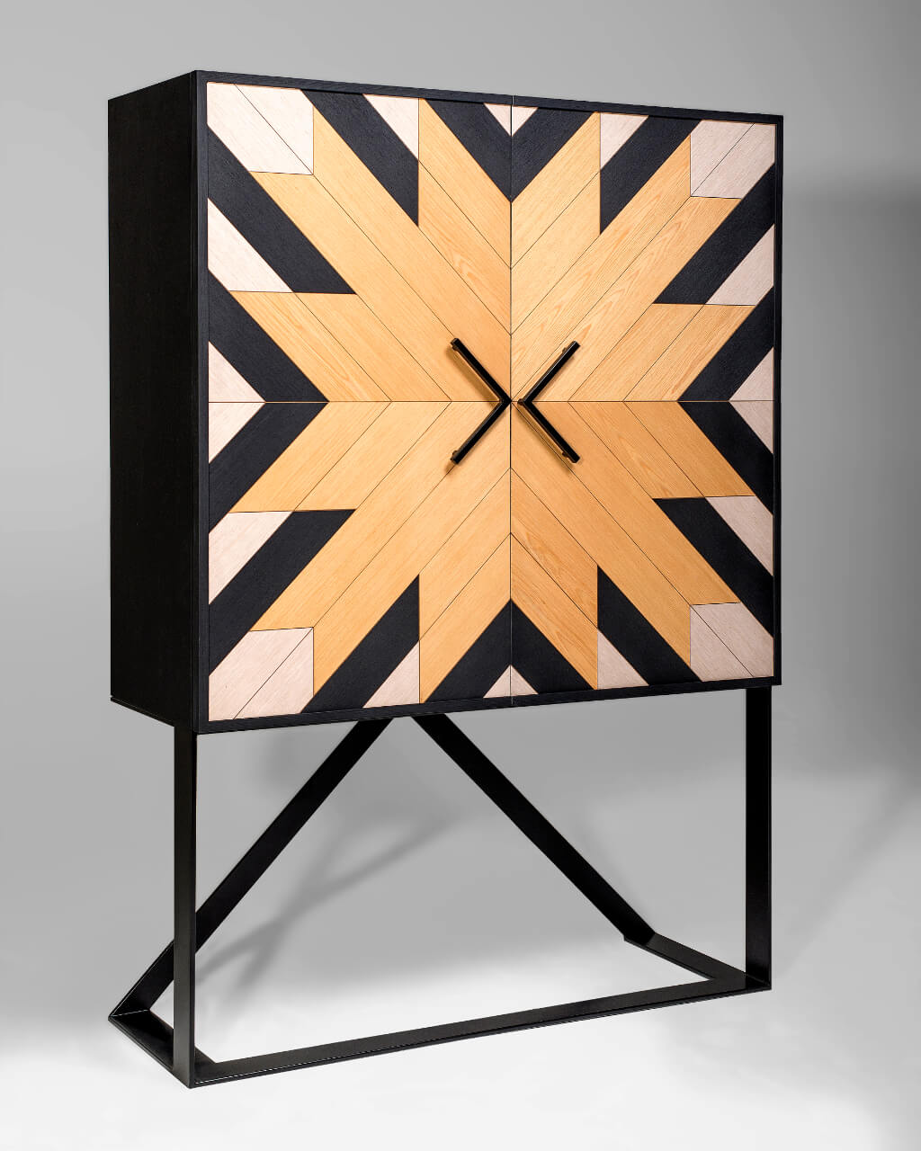 The Tigah Iki features an all handmade wood construction and hand applied studs, a sophisticated velvety fabric coated interior, a modern metallic base and dampened hinges on all doors.