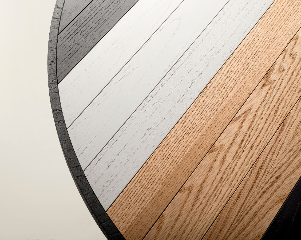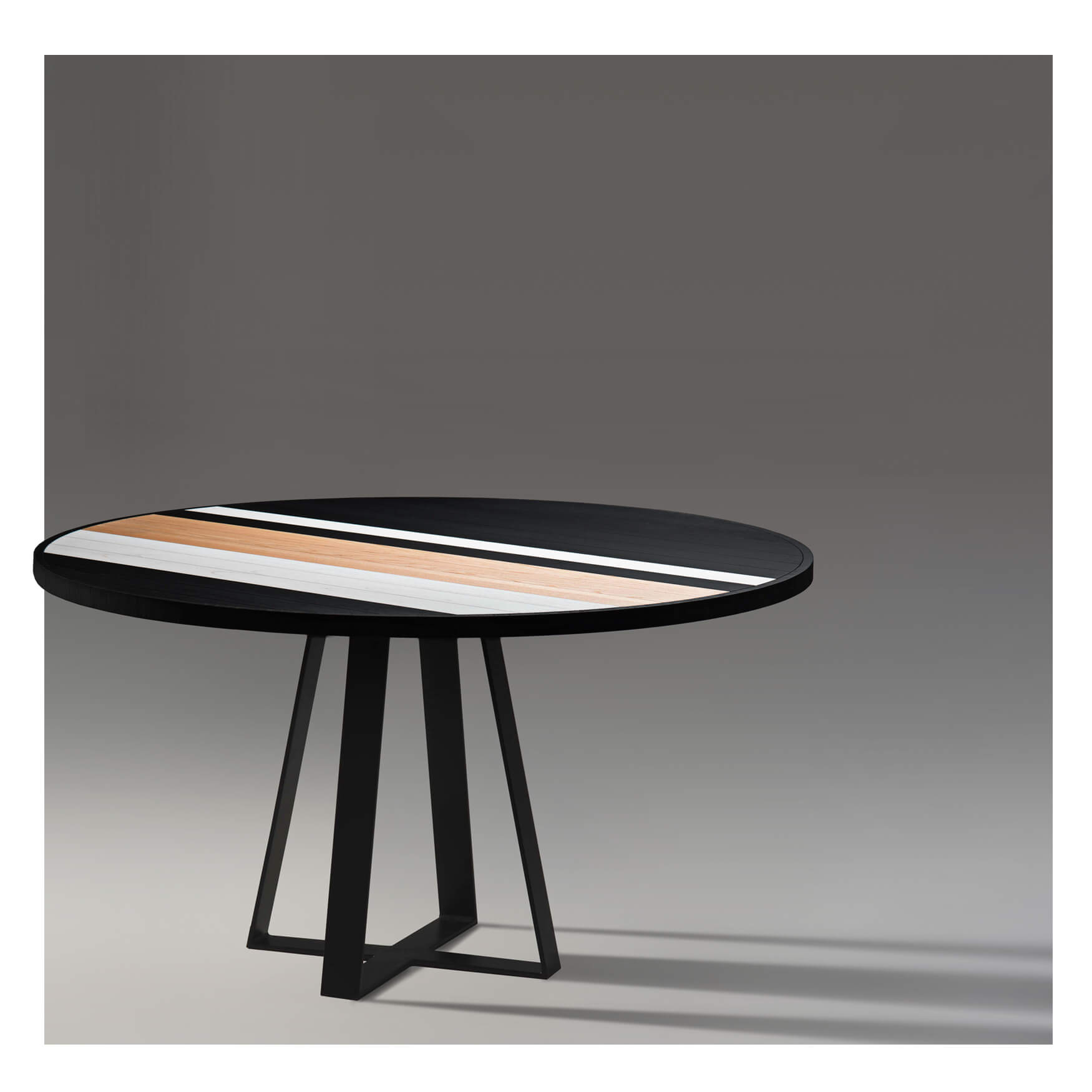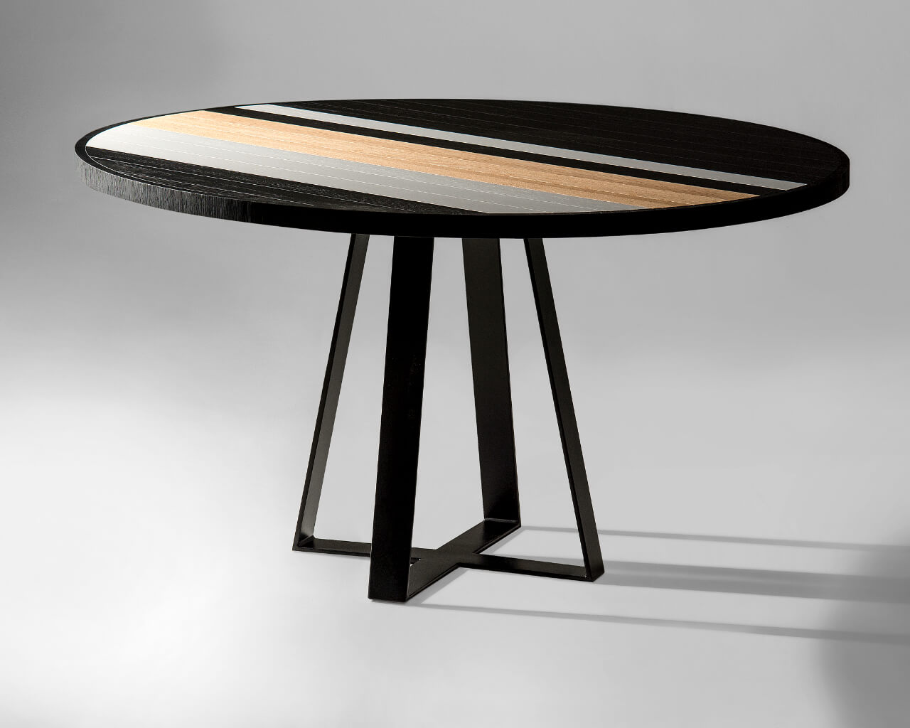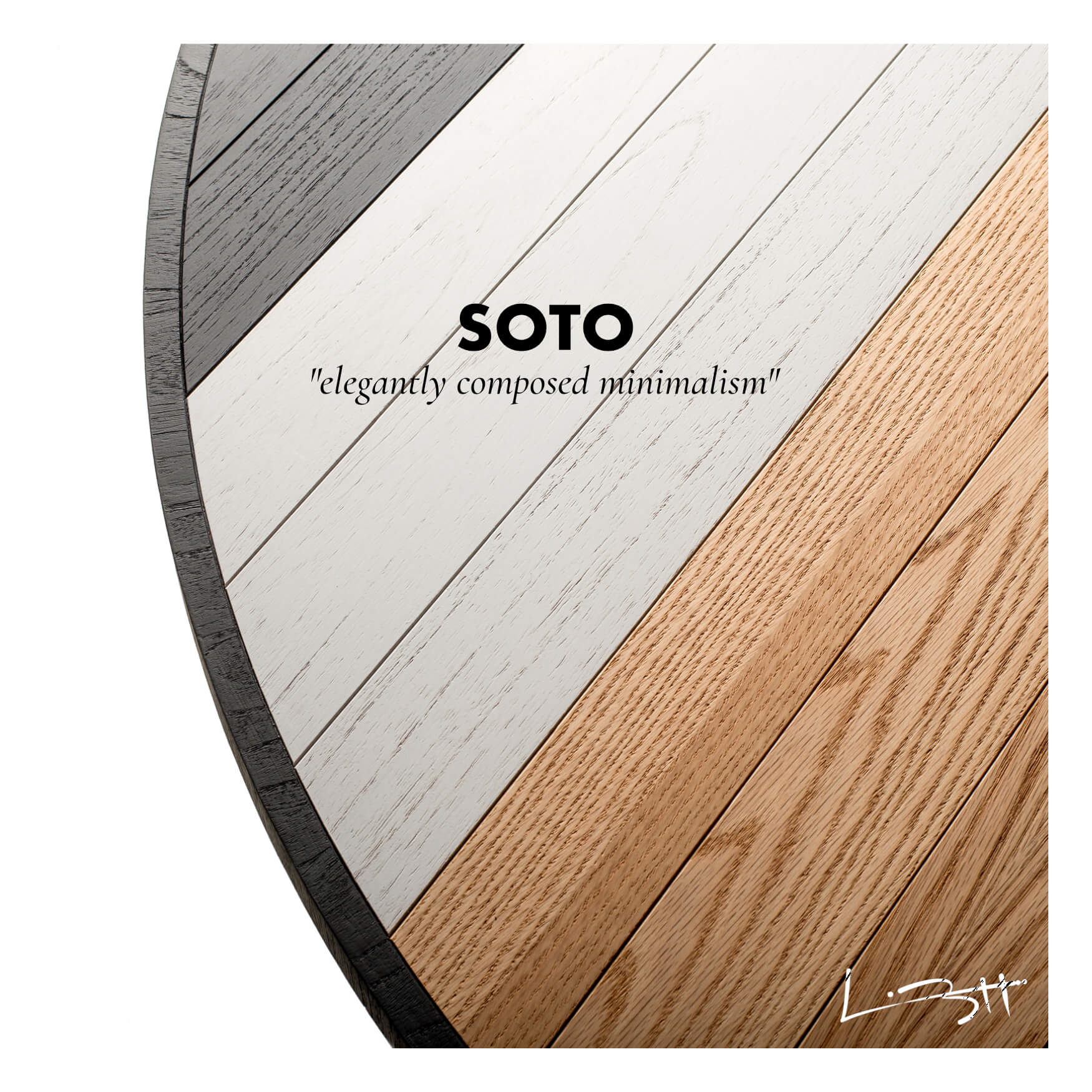 The six seater Soto Round Dining Table’s unique oakwood tabletop layout is the highest expression of Larissa’s modern take and inspiration on old-school marquetry, further manifested by the craftsman’s ability to hand-make each table from start to finish. A modern take on the table’s base with a triangular shape rounds out the look, making it an unmistakable design signed by Larissa Batista.